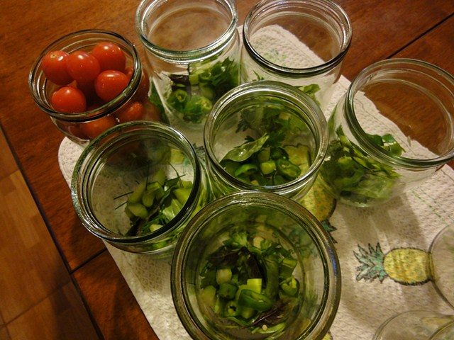 в ёмкость сложить всю зелень, сельдерей нарезать брусочками + нарезанные зубья чеснока + острый перец. сверху выложить помидоры.