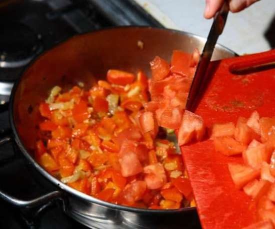 Добавляем к помидору уксус, перец и соль и слегка обжариваем.