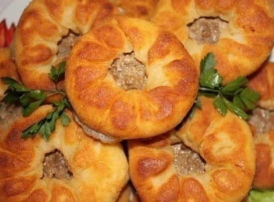 Разминаем шарики из теста в блинчик, кладем в серединку фарш и загибаем края теста так, чтобы в серединке получилось отверстие.