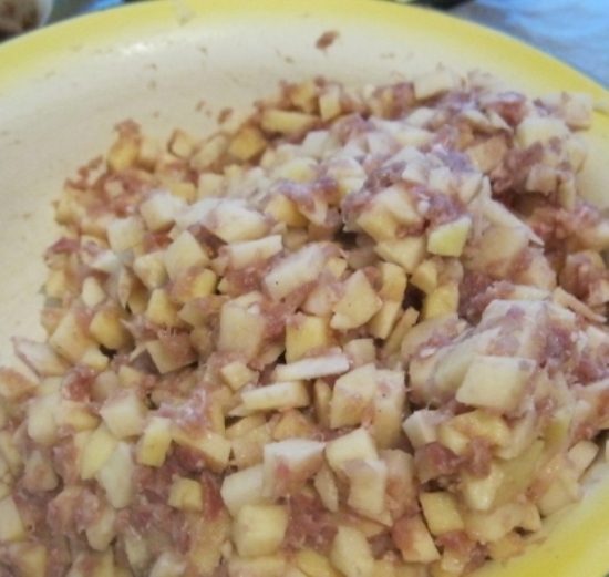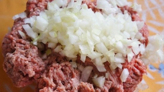 Чистим обе луковицы, мелко нарезаем и добавляем к мясу.