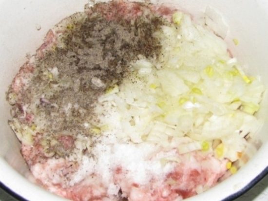 Добавляется соль, черный перец, другие специи, которые вы сочтете необходимыми (например, зиру), при желании рубленую зелень (базилик или петрушку). Все компоненты хорошо размешиваются.Получившаяся начинка не должна быть слишком густой, она должна хорошо размазываться. Если у вас получился очень крутой фарш, можно добавить немного воды или бульона.