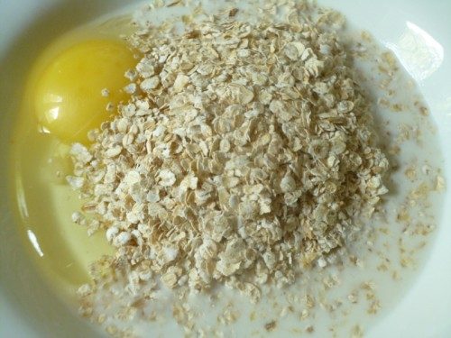 Смешайте молоко или воду с яйцом, этой смесью залейте хлопья и оставьте на 20 минут.