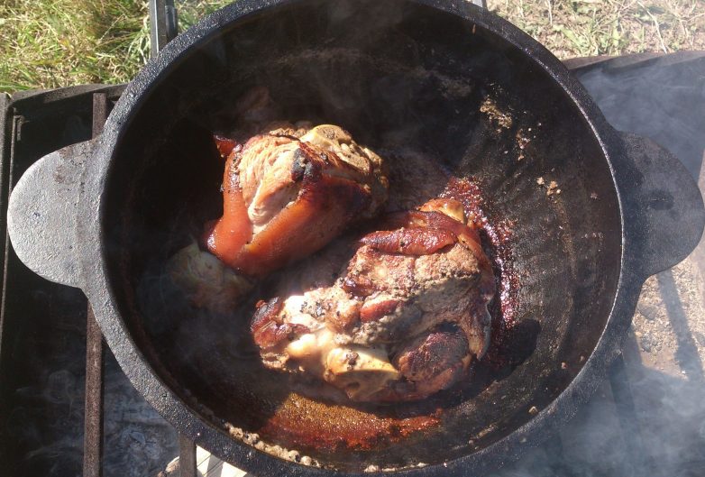 По приезду на дачу, казан, мангал. Рульку немного прижарил а потом залил маринадом и оставил минут на 45 томится на не сильном огне.