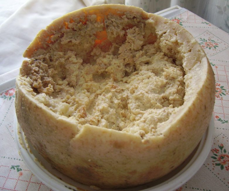 Касу марцу технически вне закона в большей части Италии, и многие сочли бы это скорее как мусор, чем еда. Тем не менее, его приготовление является дотошным как будто это прекрасный десерт: сыр из овечьего молока остается бродить; в процессе приготовления его посещают особые мухи и откладывают яйца, из которых вылупляются личинки, и ужин начинается … для личинок, то есть — не для вас; лучшее еще впереди.В конце концов, личинки достаточно смягчают сыр для употребления, и они должны быть съедены живьем вместе с сыром, чтобы предотвратить дополнительную токсичность. Если вы не хотите есть живые личинки, то можете перекрыть им кислород, поместив сыр в герметичную бумагу или пластиковый пакет. Личинки, в конечном счете, выпрыгнут из сыра в поисках воздуха и, не находя его, умирают.