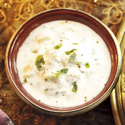 Измельчите в блендере ½ небольшой луковицы, добавьте 2 баночки натурального йогурта, 1 ч.л. порошка карри, перемешайте, добавьте немного нарезанного зеленого лука.