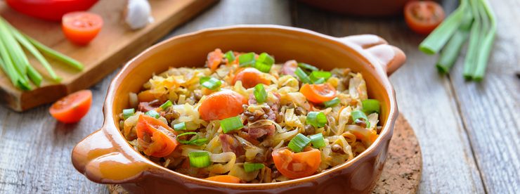 Овощные рецепты в горшочках так и манят пестрой палитрой вкусов. Нарезаем крупными ломтиками 8 картофелин и большой баклажан с кожурой, 2 морковки рубим толстыми кружками. Красный сладкий перец очищаем от плодоножки и семян, режем полосками. 200 г свежей капусты некрпуно шинкуем, 1 луковицу режем кольцами. Выкладываем овощи в 2 горшочка в такой последовательности: картофель, баклажан, перец, морковь, капуста, лук. Для любителей сытных блюд можно добавить колечками нарезанные сардельки. Размешиваем в 400 мл горячей воды 4 ст. л. сметаны, по ½ ч. л. соли и овощных специй. Вливаем эту заправку в горшочки по «плечики», сверху кладем половинки помидоров черри и запекаем в духовке при 180°C примерно 80 минут. Для летнего меню такое блюдо будет весьма актуально.