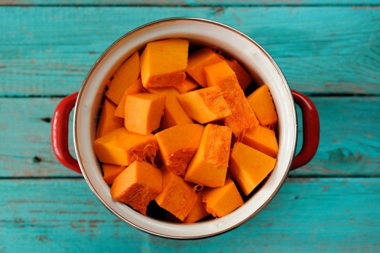 Тыкву очистить от семян и кожуры, отмерить 1,5 кг мякоти, нарезать ее кубиками, сложить в кастрюлю и влить полстакана воды.
