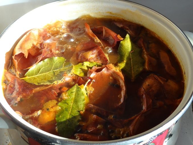 Луковую шелуху залейте водой, добавьте соль и сахар, лавровый лист, перец горошком, доведите до кипения.