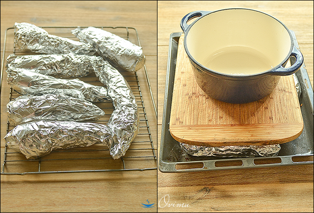 Завернул в фольгу и разложил на решетке. На решетке запекать лучше, так как горячий воздух будет обдувать баклажаны со всех сторон. Ставим на максимальную температуру, включаем гриль и конвенцию воздуха. После того как баклажаны запеклись поставим их под гнет, чтобы убрать лишнюю жидкость.