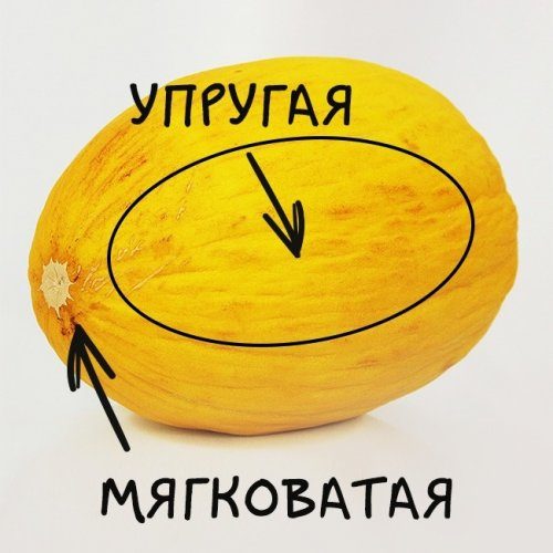 Созревшая дыня должна быть упругой, немного пружинящей, а вот на концах она может быть слегка мягковатой (но лишь слегка).