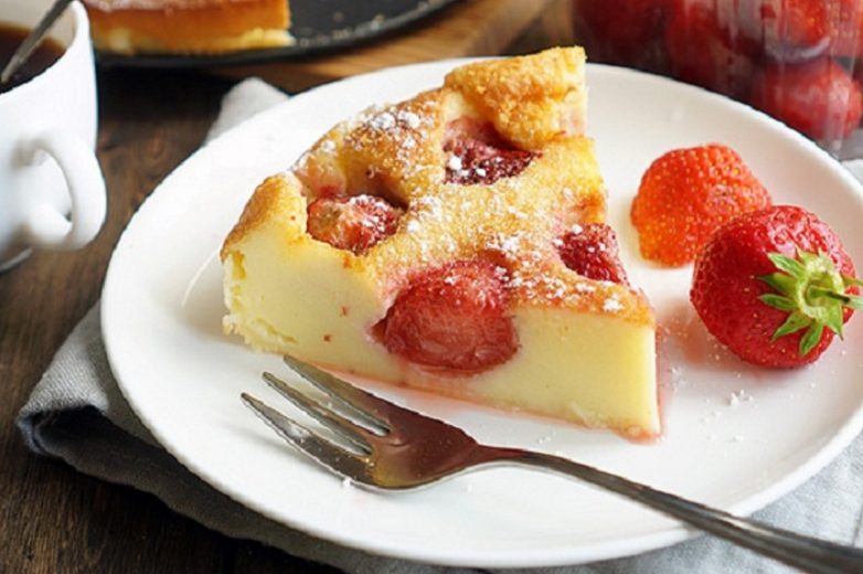 Десерт этот, действительно, невозможно описать парой слов. Это и не пирог и не запеканка, уж точно не торт, но и не тарт. А впрочем, главное попробовать его. Используйте вообще любые ягоды, которые доступны, можно сделать смесь, также подойдут мягкие фрукты вроде персика, а на крайний случай — обсушенные замороженные ягоды (конечно сперва их нужно разморозить). Очень удобны десерты, в которых наполнением может быть всё, что угодно. Я люблю этот десерт за интересную текстуру. Он плотный, совершенно не пористый, хорошо ароматизируется ягодами и есть его одно наслаждение.