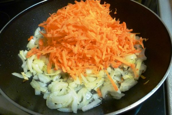 Разогрейте как следует сковороду, налейте в нее немного растительного масла и обжарьте морковь с луком до мягкости, периодически помешивая. Добавьте шампиньоны, подержите на среднем огне еще 5 минут.