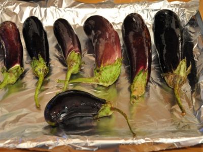 Чистые и сухие баклажаны смазать оливковым маслом, положить на противень, застеленный фольгой, и запечь в нагретой до 200 гр. духовке около 20 минут пока баклажаны не станут мягкими.