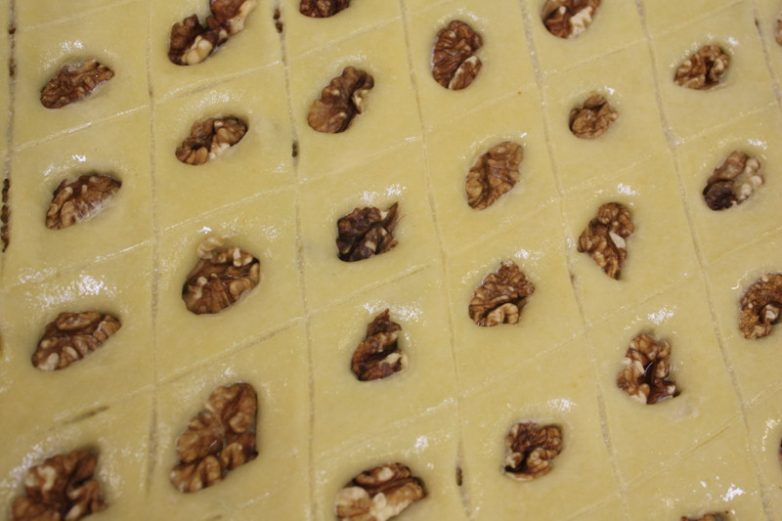 Потом уже дело времени — поставить противень с пахлавой в духовку. Но сначала его надо аккуратно нарезать ромбами.