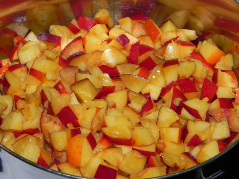 Помытые нектарины разрезать на половинки, удалить косточки и нарезать на мелкие кусочки.