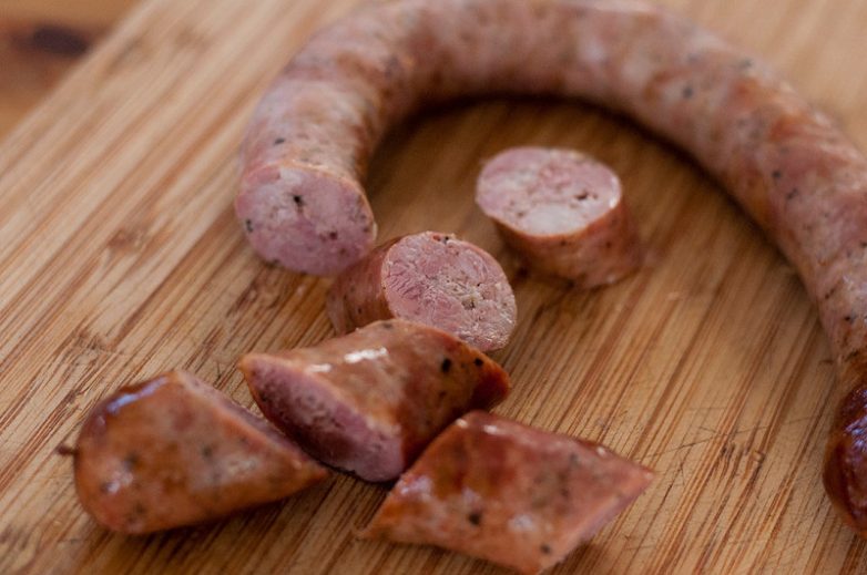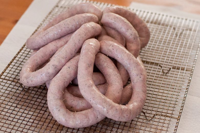 Нужно взять свинины жирностью 15-20%, провернуть ее через мясорубку с решеткой, у которой дырки не меньше сантиметра диаметром, добавить туда 1.7% от веса мяса соли, нитритной соли по-инструкции, воды 20%, фосфата сколько положено, отбить этот фарш, набить в кишку и отварить до тех пор пока температура внутри не станет 65С.