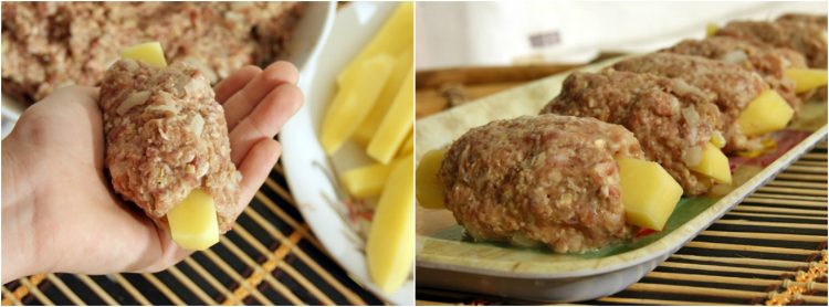 Сформируйте из фарша овальную лепешку и выложите на нее брусочек картофеля.
