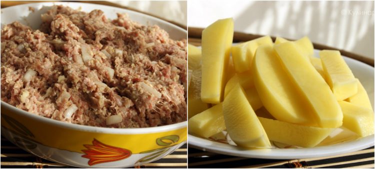 Подготовьте фарш. Для этого взбейте яйца, добавьте молоко. Залейте этой смесью овсяные хлопья и отставьте размокать. Лук и чеснок мелко нарежьте, смешайте с фаршем, посолите и поперчите по вкусу, добавьте размокшие хлопья, всё тщательно перемешайте. Картофель очистите и нарежьте брусочками.