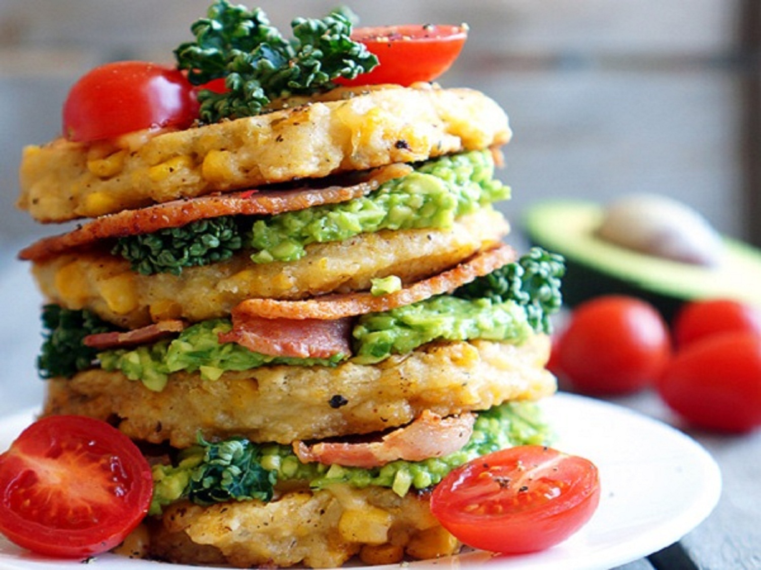 Отличный рецепт для утреннего перекуса: кукурузные фриттеры — это такие пухлые оладушки с кукурузой, я подаю их с кусочками хрустящего бекона и пастой из авокадо.