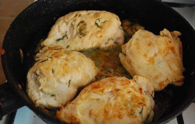 Выкладываем грудки на сковородку обжариваем на сливочном масле до золотистой корочки.