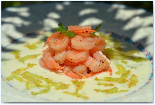 10. Теперь осталось только красиво выложить салат на тарелочку. Все ингредиенты должны быть охлаждены в холодильнике. Посередине горкой выкладываем креветки, вокруг креветок поливаем соусом, на соус выкладываем огурчики, украшаем всё листиками кориандра.