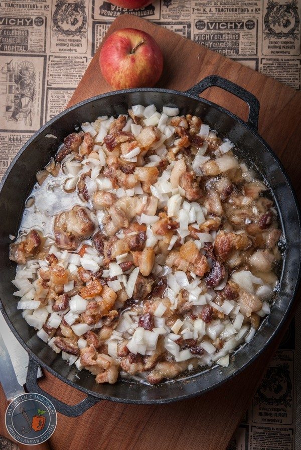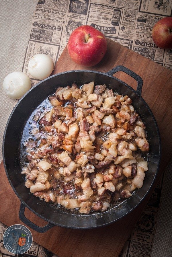 — НА этапе, когда вытопится достаточно жира, а самого сала почти не будет видно, можно всыпать порезанный кубиками лук.
