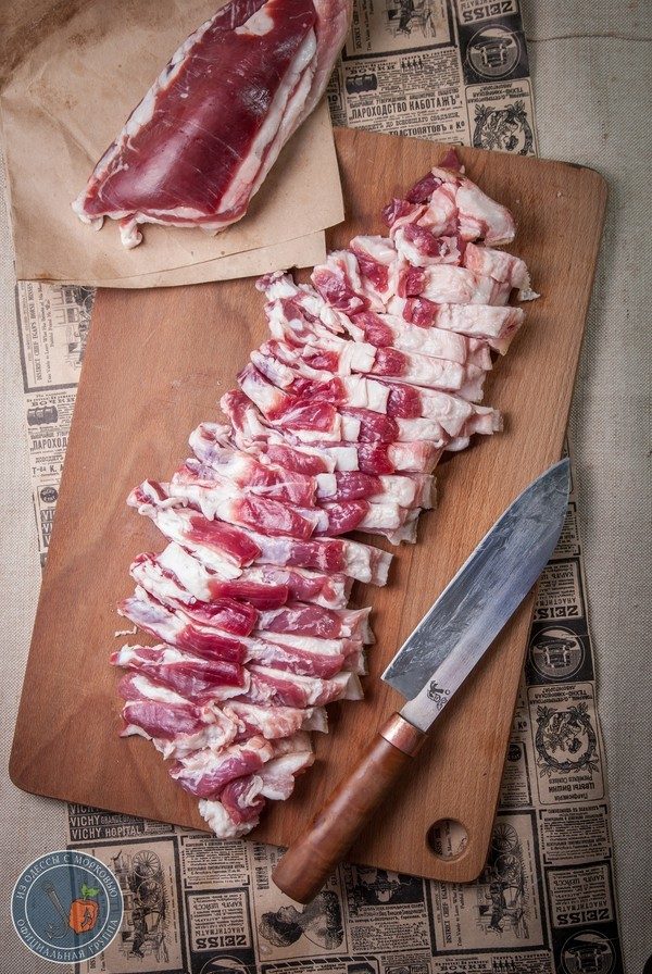 Мясо нарезать на полоски, а затем на небольшие кубики. Ничего сверхъестественного.