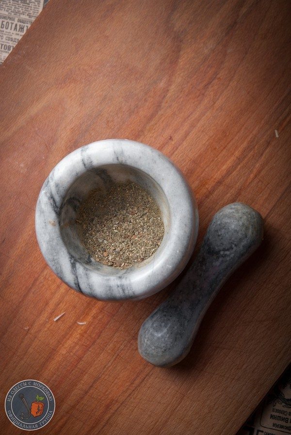 — Специи перетереть в ступке и добавить их в жаровню.