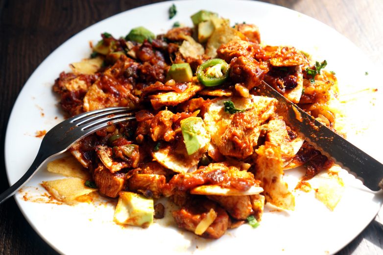 Конечно после подачи удобнее всего порезать тортильи на мелкие кусочки, получится интересная смесь — сухие кусочки чипсов из тортильи, сочный соус с курицей (или овощами на замену), свежий авокадо и много сыра. Это очень вкусно, необычное сочетание. Что сказать — мексиканцы знают во всём этом толк).