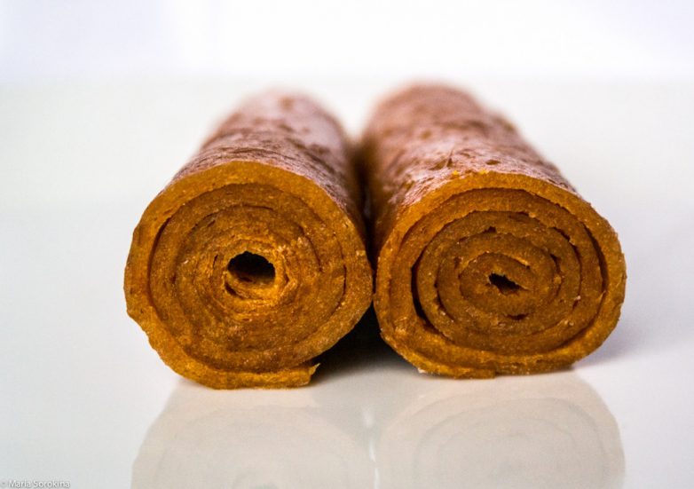 От автора: «Тонкая листовая фруктовая пастила есть много где. У нас её обычно называют леваши, в старых книгах — смоква. Бывает просто яблочная или с ягодами, а бывает и просто ягодная.»