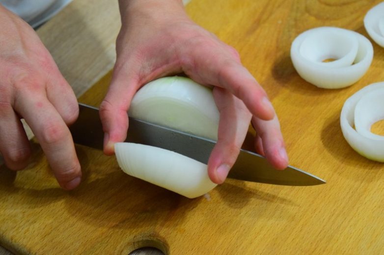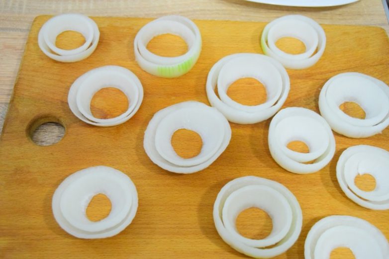 Нарезаем сыр полосками толщиной в размер луковых колец