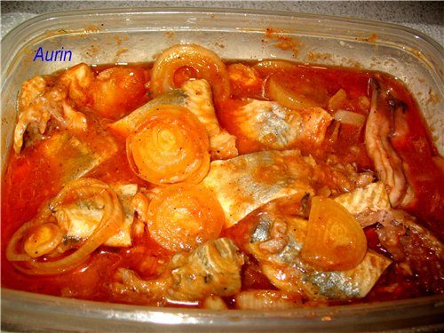 Осторожно перемешиваем. Складываем плотненько в банку, накрываем крышкой и в холодильник на сутки. А через сутки достаём нашу рыбку и кушаем.