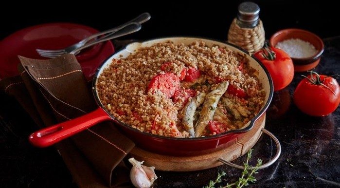 На слой помидоров выложите оставшийся лук, не него – рыбу, приправы и снова помидоры. Чередуйте рыбу и помидоры, пока не закончатся. Верхний слой – помидоры.