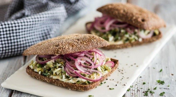 С булочки срежьте верхнюю часть. Смажьте каждую булочку внутри сметанным соусом и заполните рыбным салатом. Сверху выложите маринованный лук и накройте верхней частью булочки.