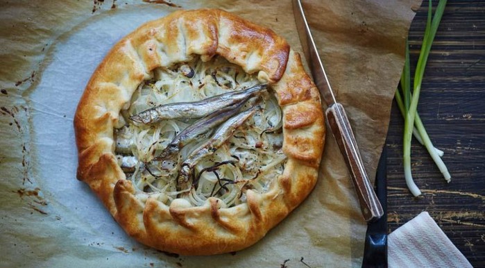 Посыпьте луком, поперчите. Приподнимая края теста, укладывайте их складками, прикрывая начинку.