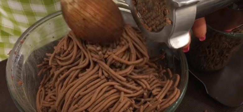 Пропустите печень с овощами 2 раза через мясорубку, сквозь мелкую решетку.