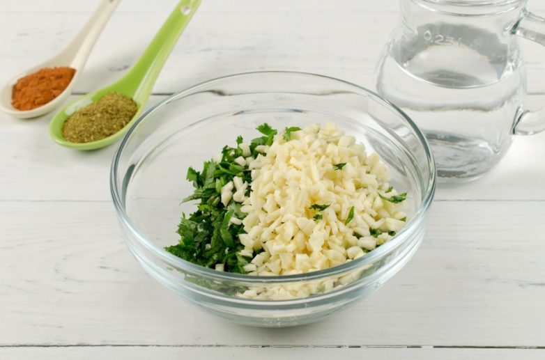 Пока курица жарится, приготовить соус. Порубить мелко зелень кинзы и зубчики чеснока.