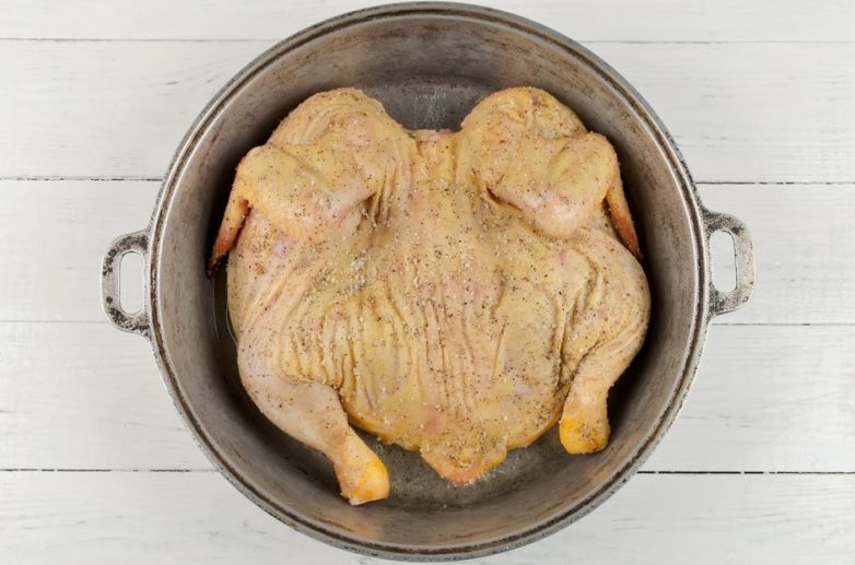 Сверху накрыть курицу тарелкой меньшего диаметра чем сковорода и поставить на нее груз (например, кастрюлю с водой. Убедитесь, что она стоит устойчиво). Обжарить таким образом курицу с двух сторон.