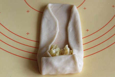 Отщипните небольшой кусочек теста и тонко раскатайте его. На край положите 1 столовую ложку начинки и заверните пирожок, как показано на фото.