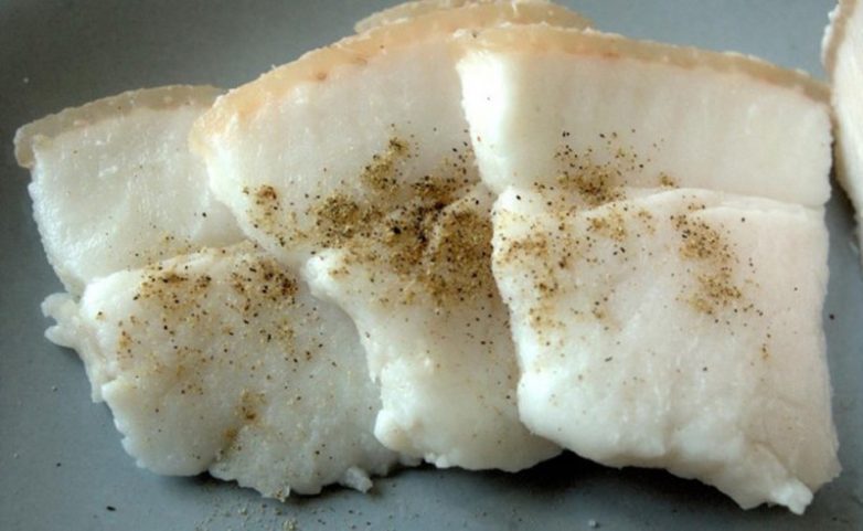 Что же итальянцы делают с этим салом дальше? Немало применений. Одно из лучших — положить тонкий ломтик сала на только что поджаренный с одной стороны кусок хлеба и дать ему подтаять. Ломтики сала кладут на бифштексы вместо сливочного масла. Нарезают на блюдце и посыпают грубой солью. В него заворачивают чернослив и кростини, едят с жареными грушами и мёдом. Известный мясник Дарио Чеккини взбивает сало до состояния шантильи, вот как.