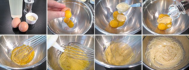Подготовьте все ингредиенты, желтки поместите в миску, добавьте горчицу. Приправьте солью и перцем. Смешайте венчиком, до получения однородной смеси. Не переставая взбивать, постепенно вливайте масло. Когда все масло будет влито, взбивайте более интенсивно. По желанию можно добавить уксус. Когда соус будет готов, перелейте его в емкость для хранения.