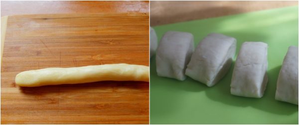 Чтобы приготовить тесто для рогаликов, смешай растопленное сливочное масло со сметаной и солью, добавь муку. Тесто должно получиться эластичной, плотной консистенции, как для пельменей.Скатай колбаску, отделив для удобства часть теста. Нарежь колбаску на кусочки, каждый из которых раскатай в лепешку диаметром примерно 10 сантиметров. Выложи 1 ст. л. начинки в центр и скатай рулетик. Проделай те же манипуляции с оставшимся тестом.