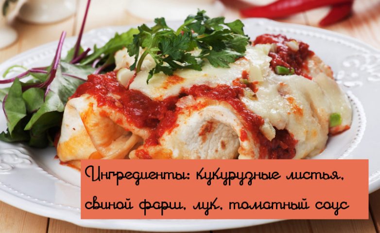 Ингредиенты: на кило свиного фарша (можно смешанного) – большая луковица, стакан томатного соуса, сушеные кукурузные листья, соль. Для теста – 2 чашки кукурузной муки, кусок сливочного масла, ложечка разрыхлителя, 2 чашки бульона, порошок чили, тмин.