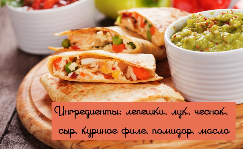 Сам процесс. Мелко режем лук, обжариваем до золотистости. Отдельно на сильном огне обжариваем нарезанное некрупными кусочками филе. Добавляем туда нарезанные помидоры, измельченный чеснок, солим-перчим, еще немножко притушиваем и воссоединяем с луком. Тортилью укладываем на сухую горячую сковороду, посыпаем тертым сыром, закладываем в нее начинку и насыпаем еще слой сыра. Закрываем второй лепешкой – и обжариваем, пока сыр не “сплавит” половинки. Теперь разрезаем на порции, подаем с сальсой – и наслаждаемся от души!