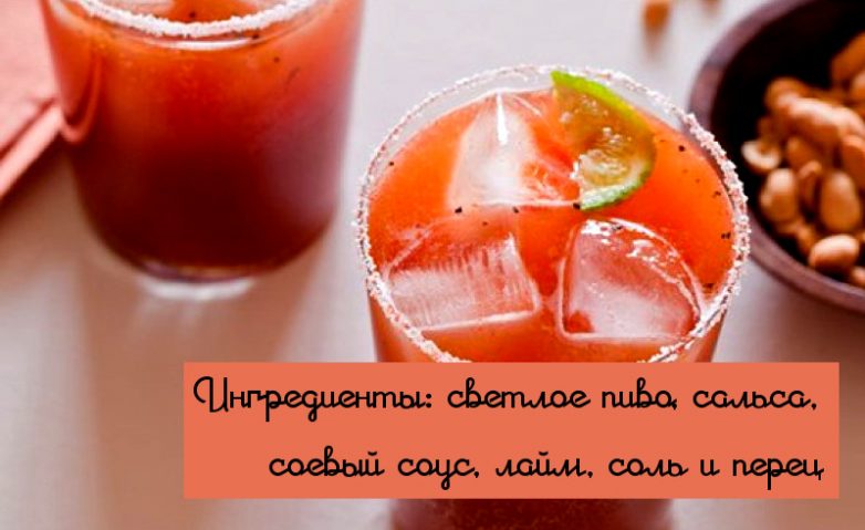 Ингредиенты: бутылка светлого пива, пара столовых ложек сальсы (можно в 2 раза больше томатного сока с каплей табаско), чайная ложечка соевого соуса, лайм, соль-перец.