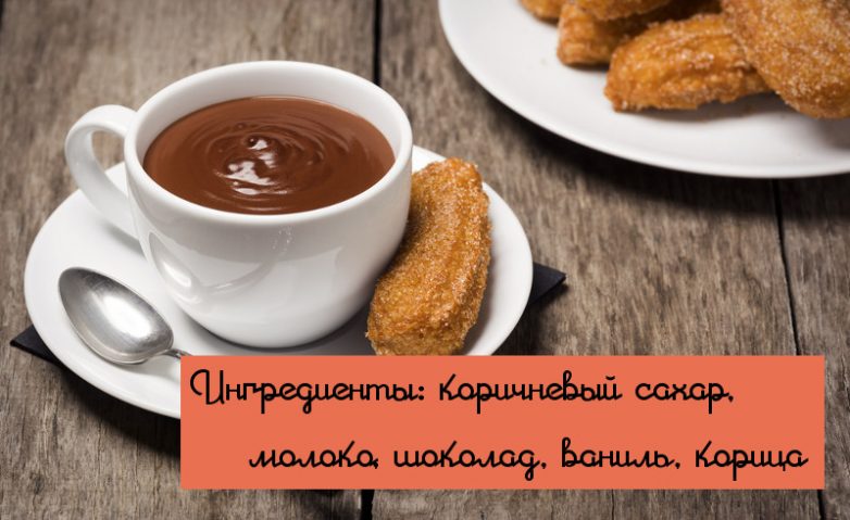 Ингредиенты: пара стаканов молока, кусочек шоколада, по паре столовых ложек кукурузной муки и коричневого сахара, ваниль, корица.
