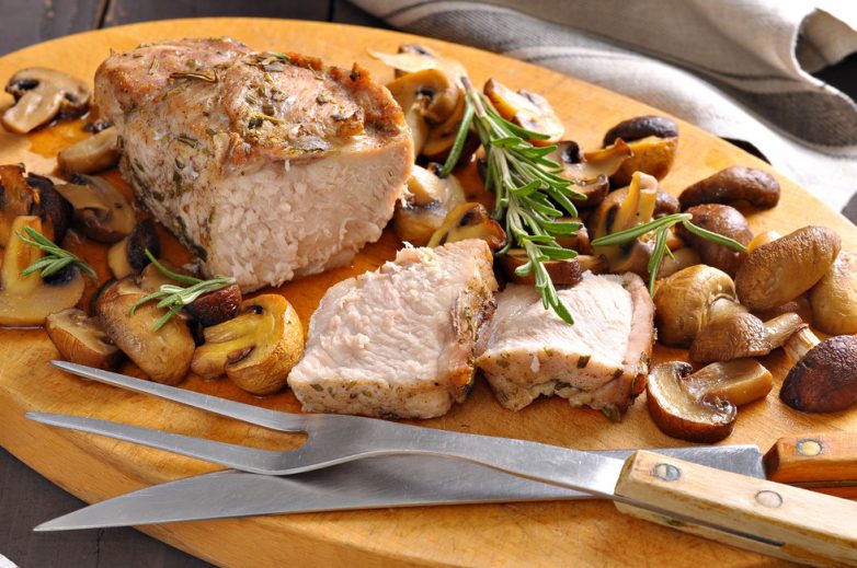 Мякоть свинины промыть, обсушить, натереть солью, чёрным перцем и мелко нарезанной зеленью розмарина. Оставить мариноваться на 30 минут. Шампиньоны разрезать пополам, если крупные — на три части. Грибы полить оливковым маслом, перемешать.