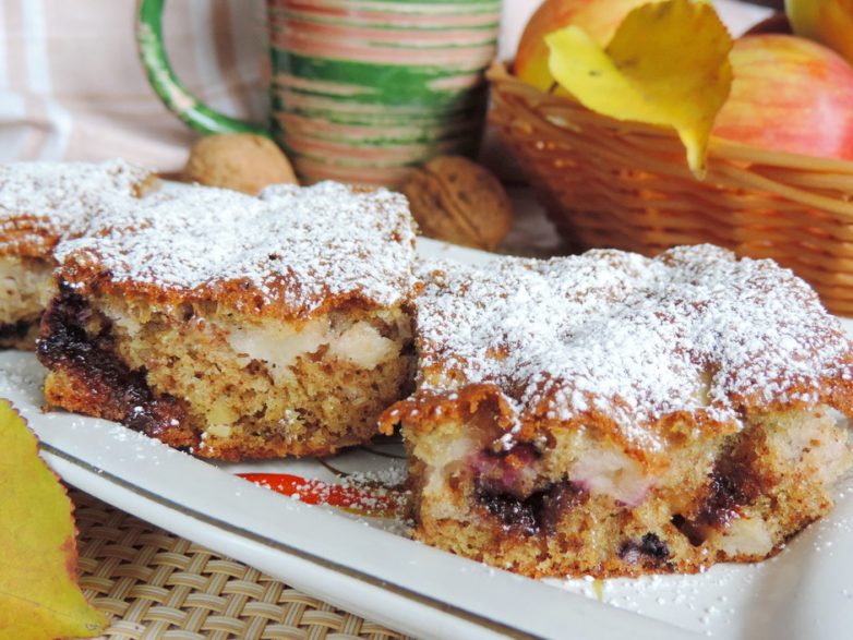 Теплый пирог порезать на порционные кусочки и посыпать сахарной пудрой.