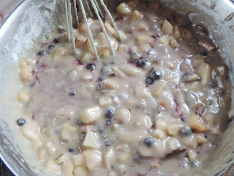 Добавить наполнитель: очищенные и порезанные мелким кубиком яблоки, рубленый грецкий орех, шоколадные капли (можно просто мелко поломать обычную шоколадку), чернику (свежую или замороженную).