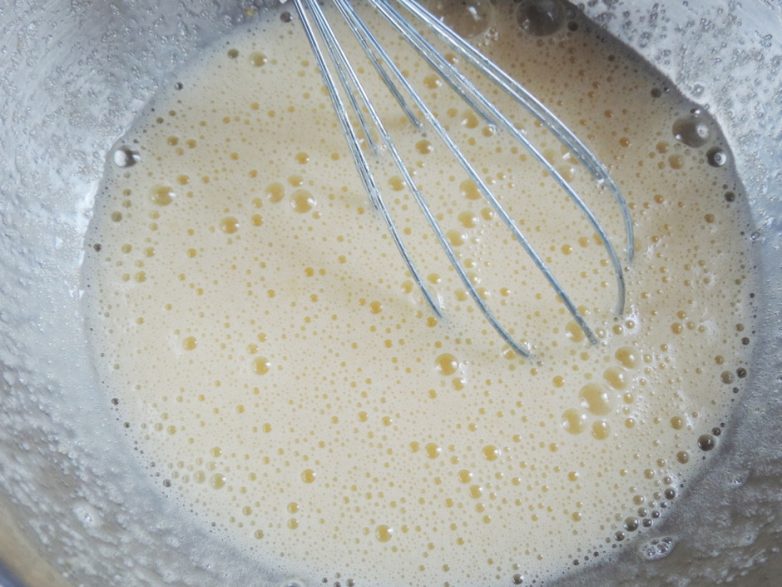 Взбить венчиком до легкой пены, затем тонкой струйкой влить растительное масло и взбить до однородности. Затем добавить муку, смешанную с разрыхлителем и корицей, перемешать до однородности.